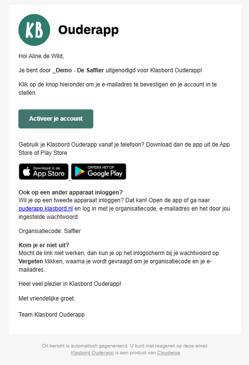 Leuk dat je gaat beginnen met Klasbord Ouderapp. In deze handleiding leggen we je uit hoe je de eerste keer kunt inloggen. Voordat je kunt met inloggen moet je eerst je account moeten activeren. Hiervoor heb je van ons een mailtje ontvangen. Heb je geen mail ontvangen, neem dan contact op met de ICT’er van je school.