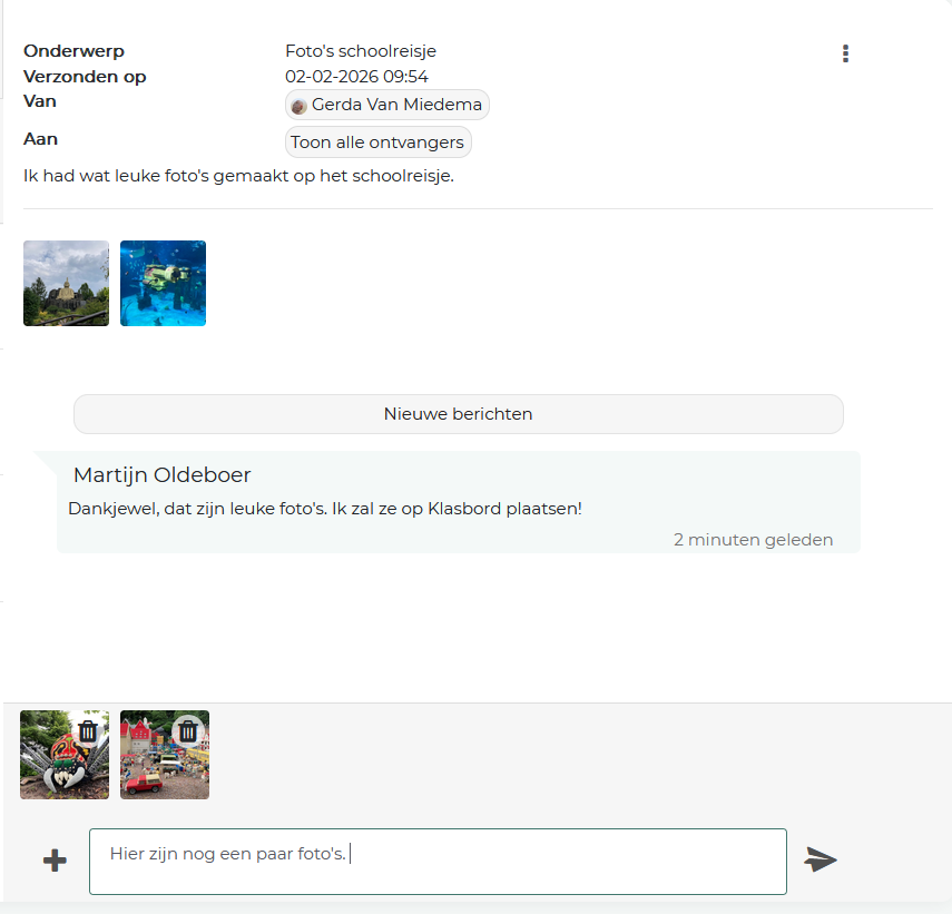 Het is vanaf nu mogelijk om bijlages (foto’s en andere bestanden zoals .pdf) toe te voegen aan reacties in de berichtenbox. Klik op het plusje om extra bestanden toe te voegen.